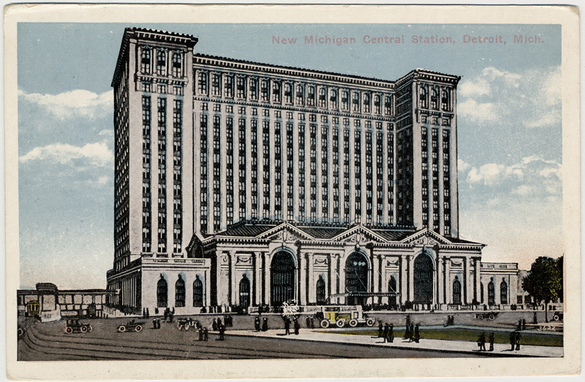 View of Michigan Central Railroad station; automobiles and pedestrians in front of building. Printed on front: "New Michigan Central Station, Detroit, Mich." Printed on back: "New Michigan Central Station, Detroit, Mich. The new Michigan Central station is located near Michigan Avenue between Fifteenth and Seventeenth Streets, covers twenty-one acres and the total cost is $15,000,000. There are eleven tracks in the station that accommodate 135 passenger coaches. It has all conveniences, such as a complete drug store with special facilities for the care of invalids and change room where travellers can at nominal cost obtain shower baths and make a change of clothing. Accommodations for passengers are not outdone by any railroad station in the world. 21, published by A.C. Dietsche, Detroit, Mich."