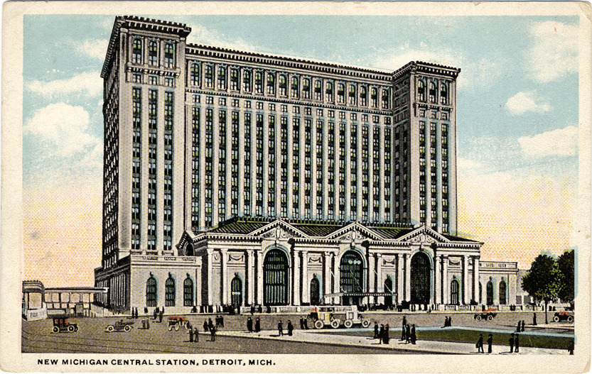 View of Michigan Central Railroad station; automobiles and pedestrians in front of building. Printed on front: "New Michigan Central Station, Detroit, Mich." Printed on back: "New Michigan Central Station. The new Michigan Central station is located near Michigan Avenue between Fifteenth and Seventeenth Streets, covers twenty-one acres and the total cost is $15,000,000.00. There will be eleven tracks in the station that will accommodate 135 passenger coaches. It will have all conveniences, such a a complete drug store with special facilities for the care of invalids and change room where travellers can at nominal cost obtain shower baths and make a change of clothing. Accommodations for passengers will not be outdone by any railroad station in the world. C.T. Co., Chicago, R-32214."