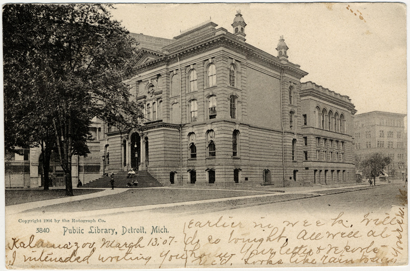 View of the Detroit Public Library located at Gratiot and Farmer. Second Empire style brick building has rounded arch windows and entrance; several people sit on front steps. Printed on front: "3840, Public Library, Detroit, Mich. Copyright 1904 by the Rotograph Co." Handwritten on front: "Kalamazoo March 13 '07, I intended writing you earlier in week. Will do so tonight. All well at home. Your letter and reports rec'd. Looks like rain today." Printed on back: "The Rotograph Co., N.Y. city (Germany). Card is postmarked March 13, 1907.