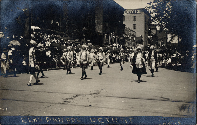 View of men wearing wigs and Colonial dress marching in the Elks parade; spectators line street. Printed on front: "Elks parade, Detroit. Photo by J.H. Cave."