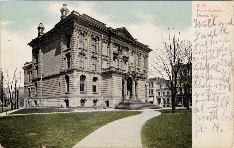 View of the Detroit Public Library located at Gratiot and Farmer. Second Empire style brick building has rounded arch windows and entrance. Printed on front: "2114, Public Library, Detroit, Mich. Manufactured by Curt Teich & Co., Chicago, Ill." Handwritten on front: "Will and I will be at home Saturday night. Fred stayed with us Sunday. There was no train until 10 at night. With love, A.H." Postmarked April 13, 1910.