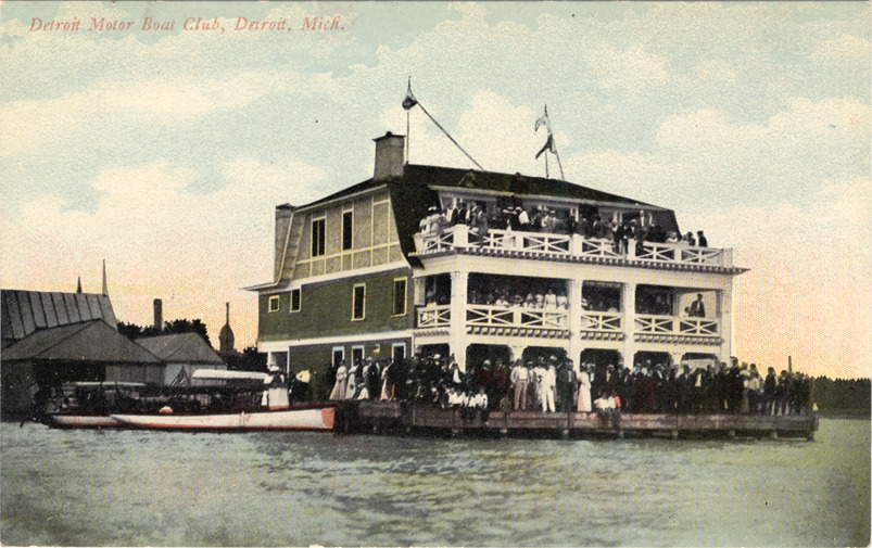 View of Detroit Motor Boat Club building at the edge of water; three-story building has gambrel roof. Crowds gather on two upper balconies of building; others stand on dock in front. Two boats moored to dock. Printed on front: "Detroit Motor Boat Club, Detroit, Mich." Printed on back: "254, published by the Detroit News Company, Detroit, Mich." Handwritten on back in upper right corner: "7/13/11."