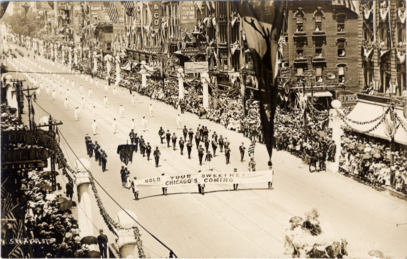 Aerial view of marching band in Elks parade; group of men playing musical instruments march in formation. Several men carry banner that reads: "Hold your sweetheart, Chicago's coming." Spectators line street; buildings are decorated with bunting and American flags. Printed on front: "Pesha photo."