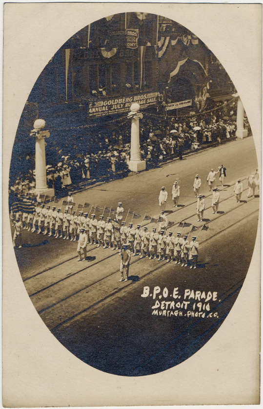 View of group of men marching in formation in Elks parade. Men wear military uniforms and carry American flags. Street is decorated with columns and garlands; spectators line street. Sign on building: "Goldberg Bros. Annual July rummage sale." Printed on front: "B.P.O.E. parade, Detroit, 1910, Murtagh Photo Co."