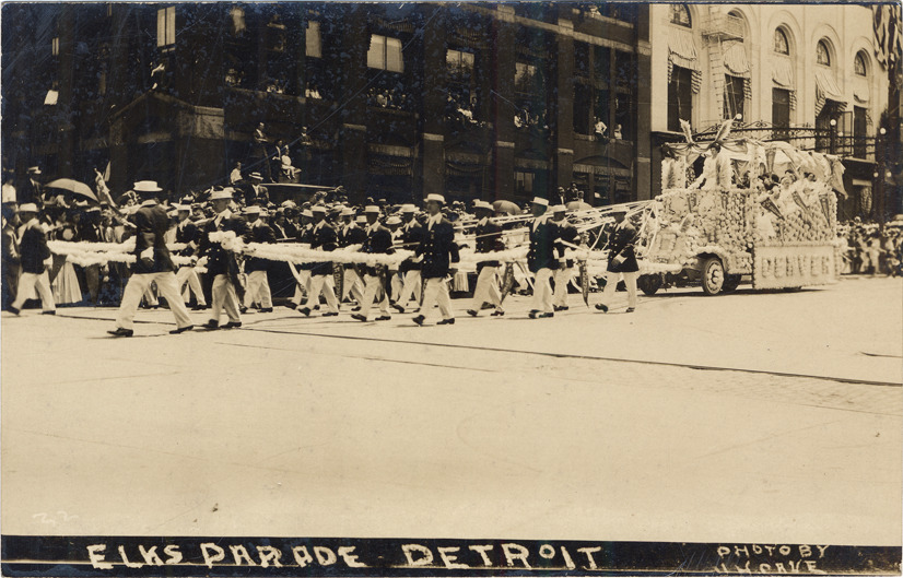 View of float in Elks parade; truck is decorated with a canopy, flowers and pennants. "Denver" is spelled out in floral decorations on side of vehicle; truck is pulled by group of men wearing suits and hats. Printed on front: "Elks parade, Detroit. Photo by J.H. Cave."