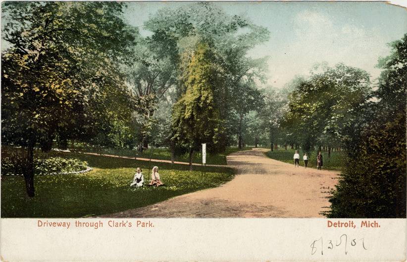 View of road in Clark Park; two girls sit on lawn adjacent to road; three boys walk on road in background. Printed on front: "Driveway through Clark's Park. Detroit, Mich." Handwritten on front: "8/30/07." Printed on back: "A7364, published by the Detroit News Company, Detroit, Mich., Leipzig, Dresden." American News Co. publisher trademark printed on back.