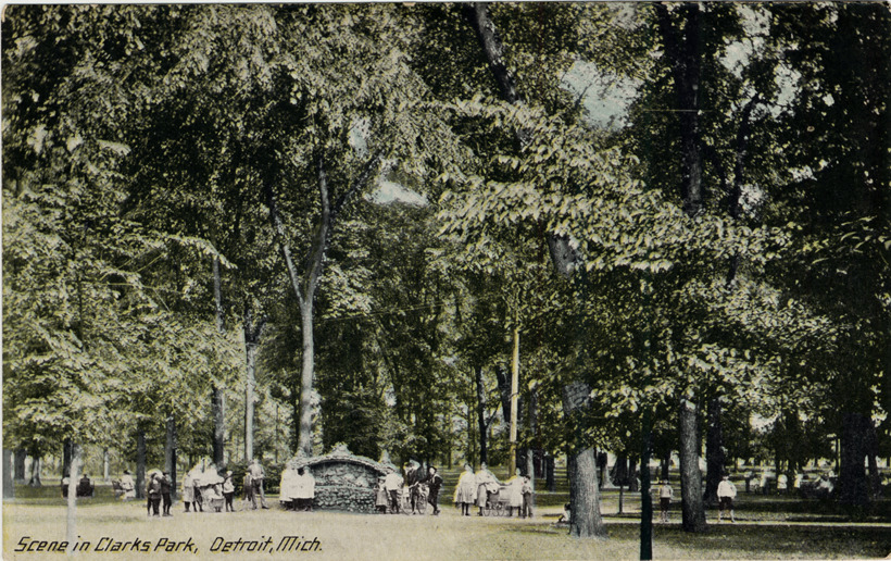 Group of men, women and children pose in front of rustic stone drinking fountain at Clark Park. Boy stands with bicycle; women push baby carriages; trees in background. Printed on front: "Scene in Clarks Park, Detroit, Mich." Handwritten on back in upper right corner: "7/27/12."