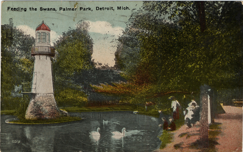 View of lighthouse on small island on lake at Palmer Park; group of people on shore feed swans. Printed on front: "Feeding the swans, Palmer Park, Detroit, Mich." Printed on back: "Scene at Palmer Park, Detroit, Mich. Palmer Park, where light house is located is a restful retreat of 120 acres and is located seven miles out Woodward Avenue. One of the delightful features is its log cabin with its quaint furniture. It has many acres of woods, children's playgrounds and a casino where refreshments are served." Handwritten on back: "How would you like to have her here? O! Same place. Will see you a week from now. Claire." Card is postmarked November 9, 1917.