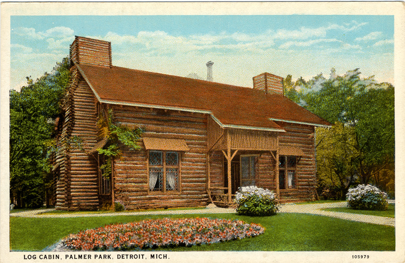 View of two-story log cabin at Palmer Park with garden bed on lawn in foreground. Printed on front: "Log cabin, Palmer Park, Detroit, Mich., 105979." Printed on back: "Palmer Park, Detroit, Michigan. Palmer Park, the city's second most popular park, was donated to the city of Detroit in 1893 by Thos. W. Palmer and Lizzie Merrill Palmer, his wife. This comprised 140 acres and was augmented in 1919 by an additional 147 acres which the people voted for on a bond issue. A large portion of the park is undeveloped. The park has a log cabin, which contains many heirlooms of the old Palmer and Merrill families. There is an old windmill placed there when the log cabin was the residence of Senator Palmer for the purpose of supplying water to the little lakes and this gives a picturesque effect. C.T. Co., Chicago."