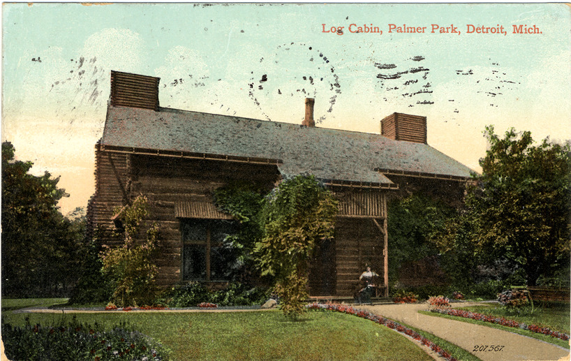 View of two-story log cabin at Palmer Park; man, woman and child sit on porch. Printed on front: "Log cabin, Palmer Park, Detroit, Mich., 207,567." Printed on back: "Published by S.H. Knox & Co., Detroit, Mich. Printed in Great Britain." Handwritten on back: "3/19/09. This has been another nice day. I did not go out to J. Miller's for supper tonight. I walked downtown and back this p.m. and I am going down again now. I was not reported this week. I will write you a letter tomorrow morning. E.A.S." Card is postmarked March 19, 1909.