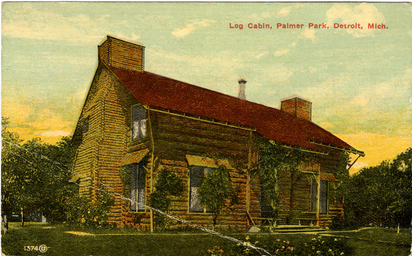 Front and side view of two-story log cabin at Palmer Park. Printed on front: "Log cabin, Palmer Park, Detroit, Mich., 1374." Printed on back: "1374, Palmer Park. Built on land donated to the city by ex-Senator Thomas W. Palmer, in 1893, and is situated north of the city at the extreme terminal of the Woodward Ave. car line; is one of the city's favorite breathing spots. Its center is a log cabin, which is an exact reproduction of the home in which Senator Palmer resided when Detroit was little more than a trading post." Souvenir Post Card Co. publisher trademark printed on back of card.