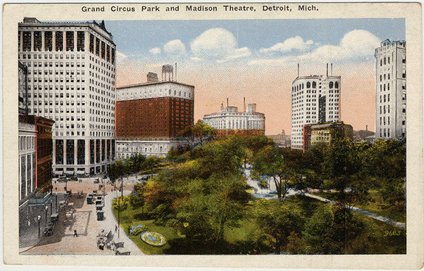 Aerial view of Grand Circus Park and surrounding buildings. Madison Theatre visible in lower left; automobiles travel in street. Printed on front: "Grand Circus Park and Madison Theatre, Detroit, Mich., 9683."