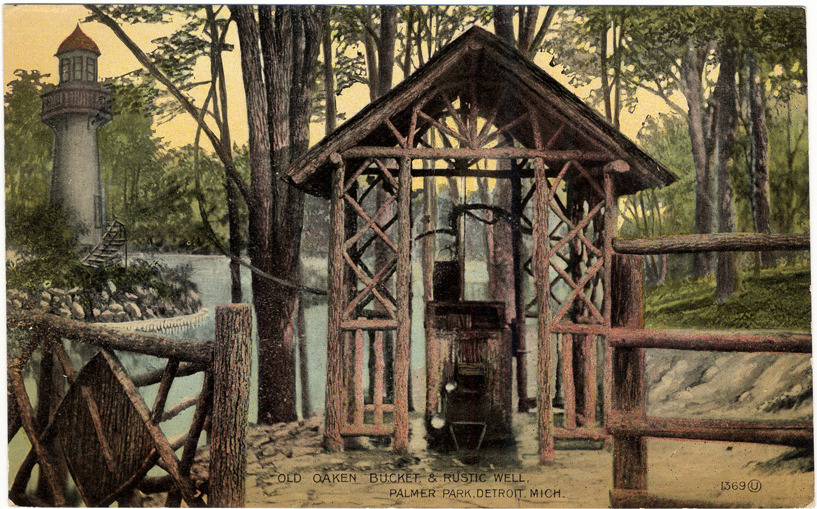 View of well and bucket enclosed by a rustic log shelter at Palmer Park. Lighthouse on lake in background. Printed on front: "Old oaken bucket & rustic well, Palmer Park." 1369, Palmer Park. Built on land donated to the city by ex-Senator Thomas W. Palmer, in 1893, and is situated north of city at the extreme terminal of the Woodward Ave. car line; is one of the city's favorite breathing spots. Its center is a log cabin, which is an exact reproduction of the home in which Senator Palmer resided when Detroit was little more than a trading post." Handwritten on back in upper right corner: "5/26/11."
