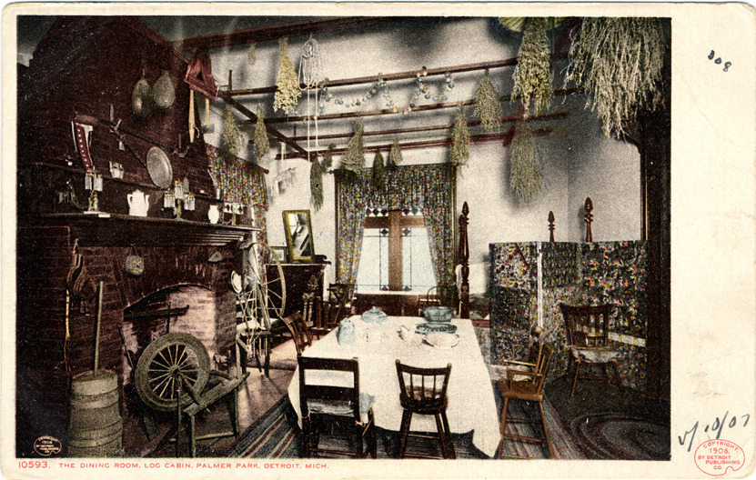 View of dining room in log cabin at Palmer Park; dining room furnished with table and chairs, churn and spinning wheel. Brick fireplace against wall; dried herbs suspended from ceiling. Printed on front: "The Dining Room, log cabin, Palmer Park, Detroit, Mich., 10593. Copyright 1906 by Detroit Publishing Co." Handwritten on front: "5/10/07.'