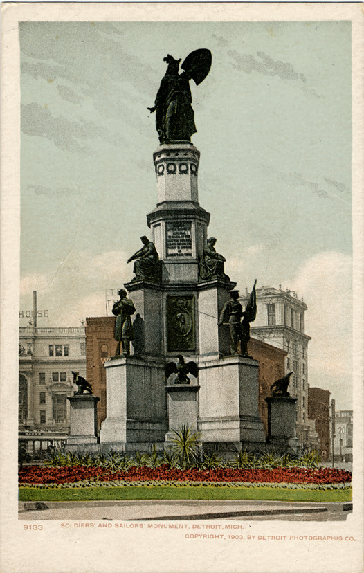 View of Soldiers' and Sailors' Monument at Campus Martius. Buildings in background. Printed on front: "9133, Soldiers' and Sailors' Monument, Detroit, Mich. Copyright 1903 by Detroit Photographig [sic] Co."
