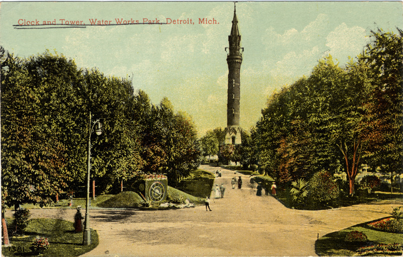 View of floral clock and water tower at Waterworks Park; pedestrians walk on paths through landscaped grounds. Printed on front: "Clock and tower, Water Works Park, Detroit, Mich." Printed on back: "Floral clock, Water Works Park, 1381. The 72-acre plot of ground of Jefferson Avenue, owned by the city and partially occupied by its water works pumping station, has been made one of Detroit's beauty spots. The water supply is pumped through a long tunnel from Lake St. Clair to the distributing point. The Park is noted for its big floral clock and the memorial at the entrance." Valentine-Souvenir Co. publisher trademark printed on back of card.