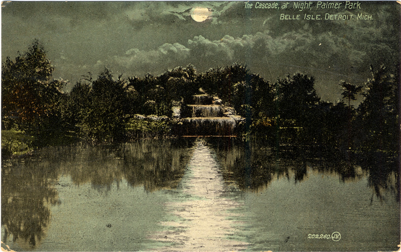 Nighttime view of waterfall cascading over rocks at Palmer Park. Waterfall is surrounded by trees and shrubs; lake or pond in foreground. Moon overhead in sky. Printed on front: "The cascade, Palmer Park, Belle Isle, Detroit, Mich., 202,260." Printed on back: "Published by S.H. Knox & Co., Detroit, Mich. Printed in Great Britain." Handwritten on back: "July 28, 1909. Dear Hatt, Glad to hear from you, say if you haven't sent the glovine, why not send it in a registered pkg you could send it for lots less, or even mail it would be alright, the express will take the profit all off. Am going to Ft. Wayne Sunday. Will take one along for ... of maybe her sister will take one too, I am well won't write until next week as we are awful busy this week. Will send a card Sunday from Ft. Wayne. Love to all." Card is postmarked July 1909.
