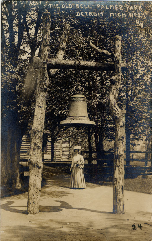 View of woman standing behind large bell suspended between two tree trunks at Palmer Park. Partial view of log cabin in background. Printed on front: "The old bell, Palmer Park, Detroit, Mich., no. 24. OWJ." Handwritten on back: "Del & I got back from Macinac [sic] Island on Sat. lovely time. Going home in morn. will write you from there. Everything is lovely. Mr. L. sends regards. Love & kisses, Alice." Card is postmarked August 27, 1912.