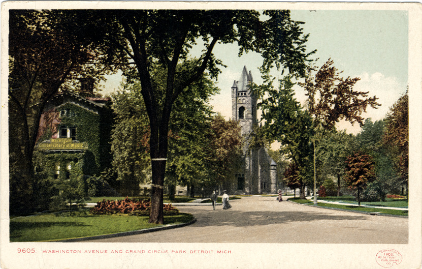 View of Grand Circus Park with church and Michigan Conservatory of Music in background; men and women walk on path through park. Printed on front: "9605, Washington Avenue and Grand Circus Park, Detroit, Mich. Copyright 1905 by Detroit Publishing Co."