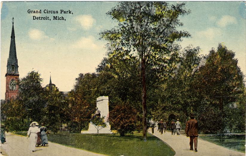 Favorite this☆ Grand Circus Park Description: View of pedestrians walking along paths in Grand Circus Park; side view of Hazen S. Pingree monument on lawn. Church steeple in background. Printed on front: "Grand Circus Park, Detroit, Mich." Details Resource ID: bh004765 Subject: Parks--Michigan--Detroit Pingree, Hazen S., 1840-1901--Monuments--Michigan--Detroit Statues--Michigan--Detroit Church buildings--Michigan--Detroit Postcards Date Issued: 1910 (year approximate) Format: 1 postcard : col. ; 3.5 x 5.5 in. Member of: Burton Historical Collection Filing Location: D/Parks-Grand Circus Park Rights: Physical rights are retained by DPL. Copyright is retained in accordance with U.S. copyright laws.