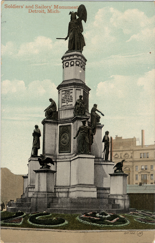 Close-up view of Soldiers' and Sailors' Monument at Campus Martius. Base of monument is landscaped with flowers; buildings in background. Printed on front: "Soldiers' and Sailors' Monument, Detroit, Mich., 207,560." Printed on back: "Published by S.H. Knox & Co., Detroit, Mich. Printed in Great Britain."