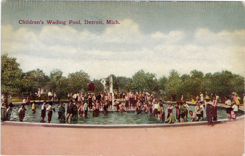 View of children wading in fountain at Clark Park. Printed on front: "Children's wading pool, Detroit, Mich." Printed on back: "The children's bathing pools are one of the many delights afforded to the children of the city and their little visitors. There is one located in Clark's Park and another in Perrien Park. They are under the supervision of the Park and Boulevard Commission." Handwritten on back in upper right corner: "9/23/10."