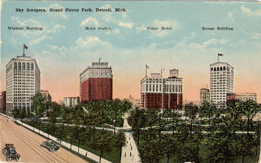View of tall buildings bordering Grand Circus Park. Printed on front: "Sky scrapers, Grand Circus Park, Detroit, Mich. Whitney building, Hotel Statler, Tuller Hotel, Kresge building." Printed on back: "Skyscrapers, Grand Circus Park. This view overlooks Woodward Avenue and West Grand Circus Park, around which is the new hotel and office building centre. Published by United News Co., Detroit, Mich."