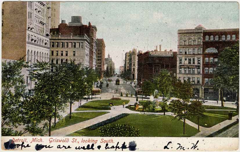 View of Capitol Park surrounded by commercial buildings; Griswold St. in background. Fountain in center of park; sign on building in background: "Dean, Godfrey & Co., interior decorators." Printed on front: "Detroit, Mich. Griswold St., looking south." Handwritten on front: "Hope you are well & happy. L.M.W." Printed on back: "Published by S.H.K. & Co, Detroit, Mich. Made in Germany."