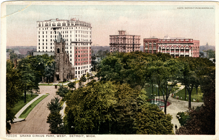 Aerial view of Grand Circus Park surrounded by commercial buildings and church; fountain in park visible through trees. Printed on front: "70036, Grand Circus Park, West, Detroit, Mich. Copr. Detroit Publishing Co." Printed on back: "Phostint card made only by Detroit Publishing Co."