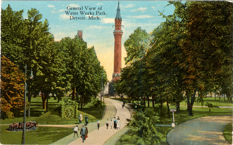 Favorite this☆ Waterworks Park Description: View of pedestrians walking on path in Waterworks Park near floral clock; water tower in background. Printed on front: "General view of Water Works Park, Detroit, Mich." Printed on back: "C.T. Co., Chicago, A-84089." Details Resource ID: bh004802 Subject: Water towers--Michigan--Detroit Parks--Michigan--Detroit Clocks and watches--Michigan--Detroit Floral decorations--Michigan--Detroit Postcards Publisher: Curt Teich & Co. Date Issued: Unknown year Format: 1 postcard : col. ; 3.5 x 5.5 in. Member of: Burton Historical Collection Filing Location: D/Parks-Waterworks Rights: Physical rights are retained by DPL. Copyright is retained in accordance with U.S. copyright laws.