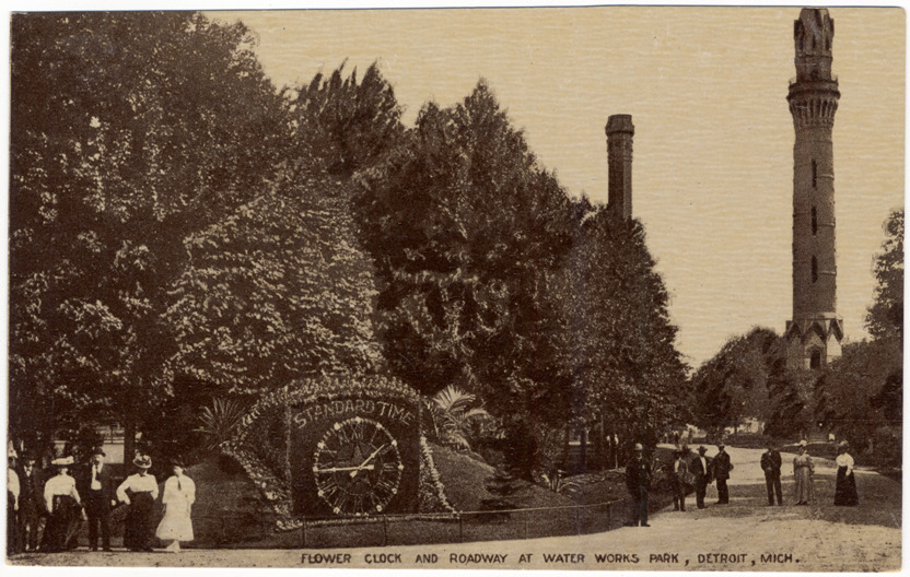 View of pedestrians standing on paths near floral clock at Waterworks Park; clock has star and Roman numerals on face and "Standard time" sign. Water tower in background. Printed on front: "Flower clock and roadway at Water Works Park, Detroit, Mich." Printed on back: "The W.E. Wendling Co., publishers, Detroit, Mich." Handwritten on back in upper right corner: "5/26/25."