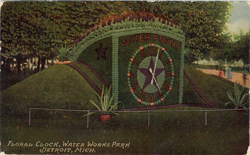 View at an angle of floral clock at Waterworks Park; clock has star and Roman numerals on face and "Water power" sign. Printed on front: "Floral clock, Water Works Park, Detroit, Mich." Printed on back: "1384. Floral clock, Water Works Park. The 72-acre plot of ground on Jefferson Avenue, owned by the city and partially occupied by its water works pumping station, has been made one of Detroit's beauty spots. The water supply is pumped through a long tunnel from Lake St. Clair to the distributing point. The Park is noted for its big floral clock and the memorial at the entrance." Handwritten on back: "Dearest brother, Why don't you write me? Am sorry you are out of work? Gee this a place for your life? I am a little homesick now but will try and forget it! Now answer this soon from your loving sister, Sadie Warner." Card is postmarked July 20, 1911.