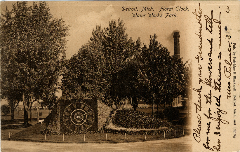 View of floral clock at Waterworks Park; clock has star and Roman numerals on face. Trees and brick chimney in background. Printed on front: "Detroit, Mich. Floral clock, Water Works Park. Pub. by Patridge & Blackwell, Detroit, Mich. and Leipzig." Handwritten on front: "Please thank your Grandmother for me for the flowers and tell her I enjoyed them so much. Mrs. Palmer." Card is postmarked August 27, 1906.