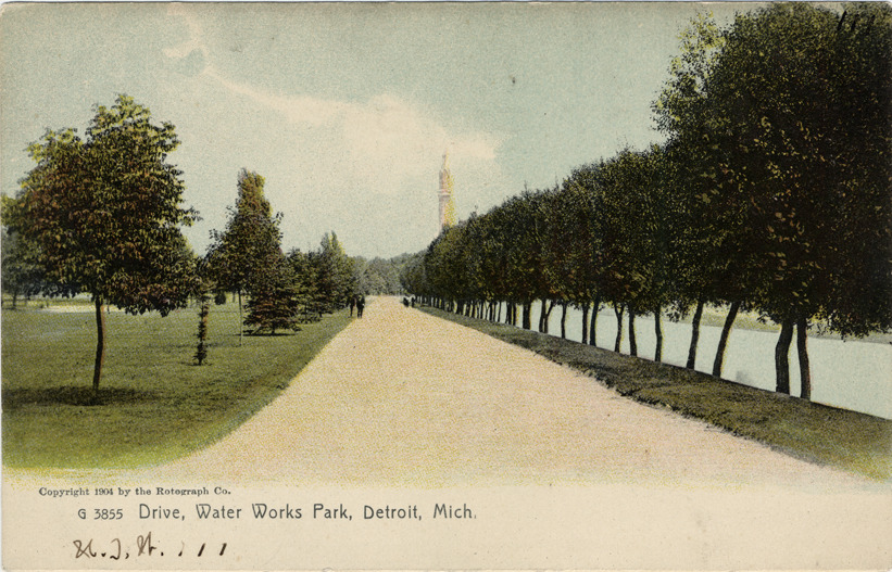 View of pedestrians walking down tree-lined road in Waterworks Park; water tower in background. Printed on front: "Drive, Water Works Park, Detroit, Mich., G3855. Copyright 1904 by the Rotograph Co." Handwritten on front: "N.J.W. 111." Printed on back: "The Rotograph Co., N.Y. city (Germany)." Handwritten on back: "N.J.W. 1/25/07."