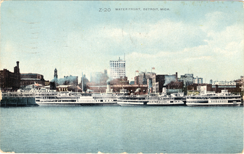 View of Detroit riverfront; ferries docked along shore. Commercial buildings in background. Printed on front: "Z-20, Waterfront, Detroit, Mich." Handwritten on back: "Have you written to them for the goods. If not do so as everything is all O.K. Now get my letter. Love to all, Papa." Card is postmarked June 14, 1910.