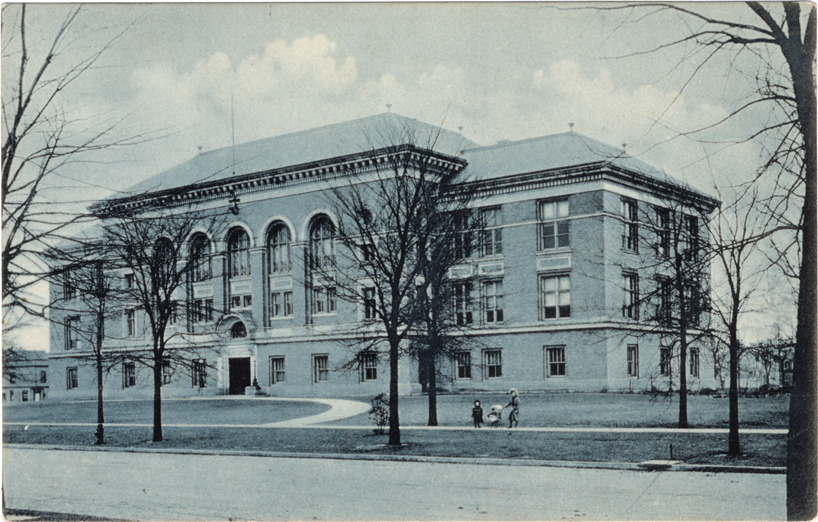 View of Eastern High School; three-story brick building has rounded arch windows on facade. Two girls stand with baby carriage on sidewalk. Printed on back: "No. 366, Detroit, Mich., Eastern High School. A.C. Dietsche, Detroit, Mich. and Leipzig. Made in Germany."