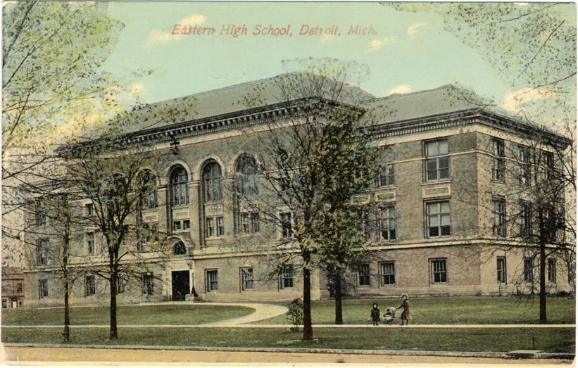 View of Eastern High School; three-story brick building has rounded arch windows on facade. Two girls stand with baby carriage on sidewalk. Printed on front: "Eastern High School, Detroit, Mich." Printed on back: "The Eastern High School, on East Grand Boulevard, is one of the three instituions of its kind in the city. It is supported by taxation and open to children of suitable age at free tuition. The city paid $25,000 for the site and $268,800 for the construction of the building." Handwritten on back: "School where Aunt Clara Hyde last taught."