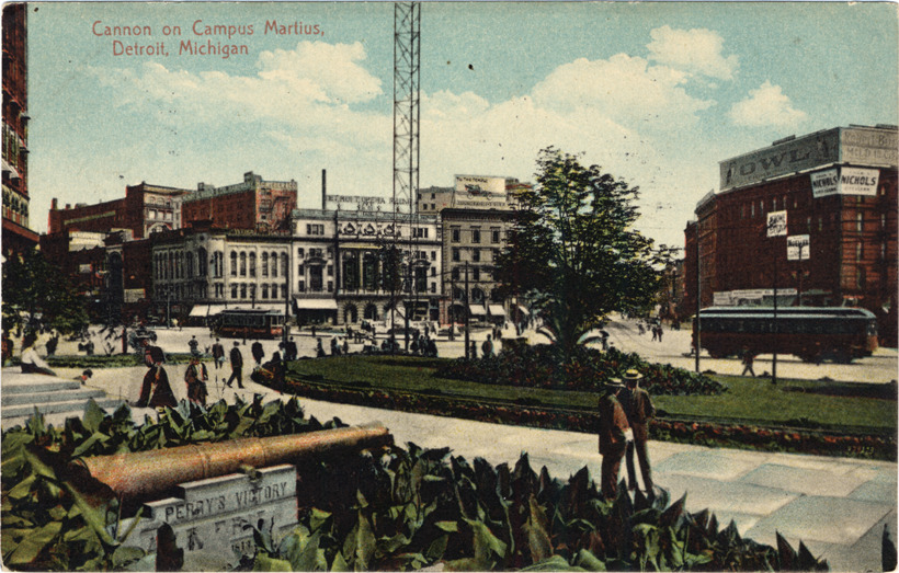 View of cannon on Campus Martius; "Perry's victory, 1813" inscribed on base. Pedestrians walk in street; Detroit Opera House in background. Printed on front: "Cannon on Campus Martius, Detroit, Michigan." Printed on back: "Publ. by Wolverine News Co., Detroit, Mich., no. 809, made in Germany." Handwritten on back: "Dear Father, I will be up to Tasmoo on the Toledo. Be sure and meet Ila and I there. G.S." Card is postmarked July 24, 1909.