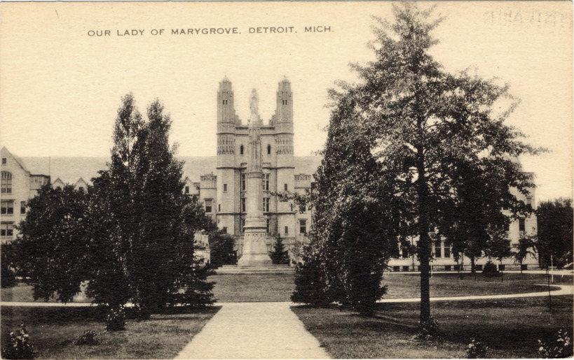 View of Our Lady of Marygrove College; Gothic style building with statue of Mary on pedestal in front of building. Building is partially obscured by trees. Printed on front: "Our Lady of Marygrove, Detroit, Mich." Printed on back: "Artvue Post Card Co., 225 Fifth Ave., New York, N.Y."