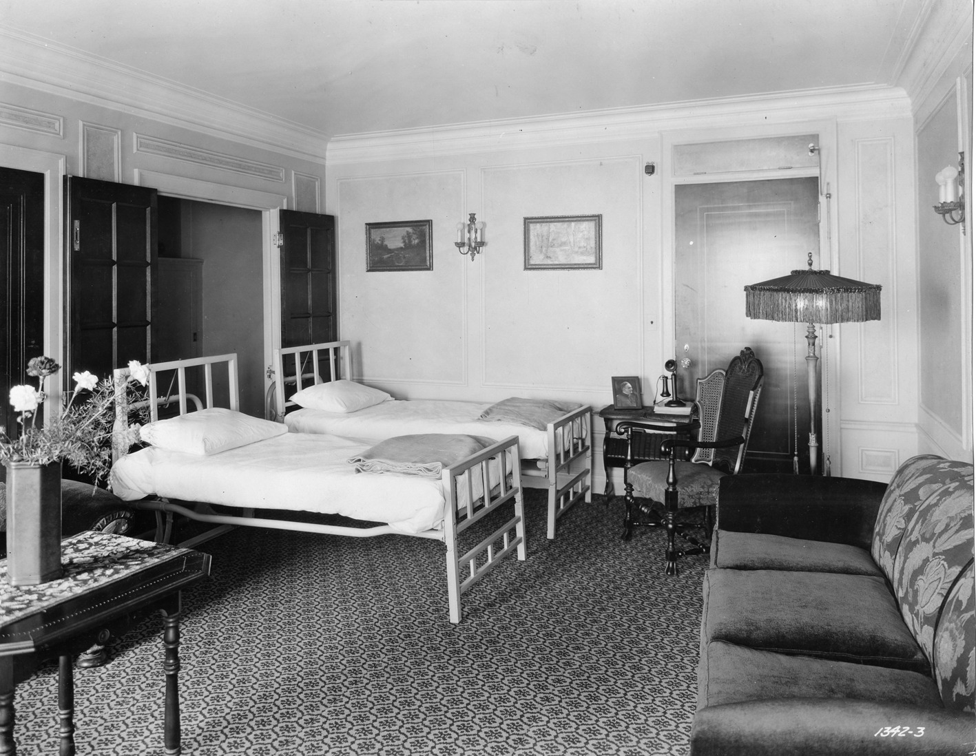 View of a bedroom in the Seville Apartments. Written on photo front: "1342-3." Stamped on photo back: "Commercial Photo Service Co. 25th floor, First Nat'l Bank building, Detroit, Mich. Cadillac 3431, Cadillac 3432."
