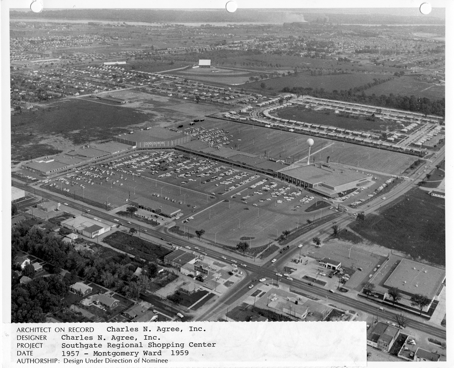 Aerial view of Southgate Mall, caption pasted on front: "Architect on record: Charles N. Agree, Inc.; Designer: Charles N. Agree Inc.; Project: Southgate regional shopping center; Date: 1957- Montgomery Ward 1959; Authorship: Design under direction of nominee." Handwritten on photo back: "Southgate S.C. completed 1957, Ward's added 1959." Stamped on photo back: "New address: Jack M. Richards, photographer. 22720 Woodward, Ferndale 20, Mich. LI.2-4520." Photograph has been hole-punched in the margin.