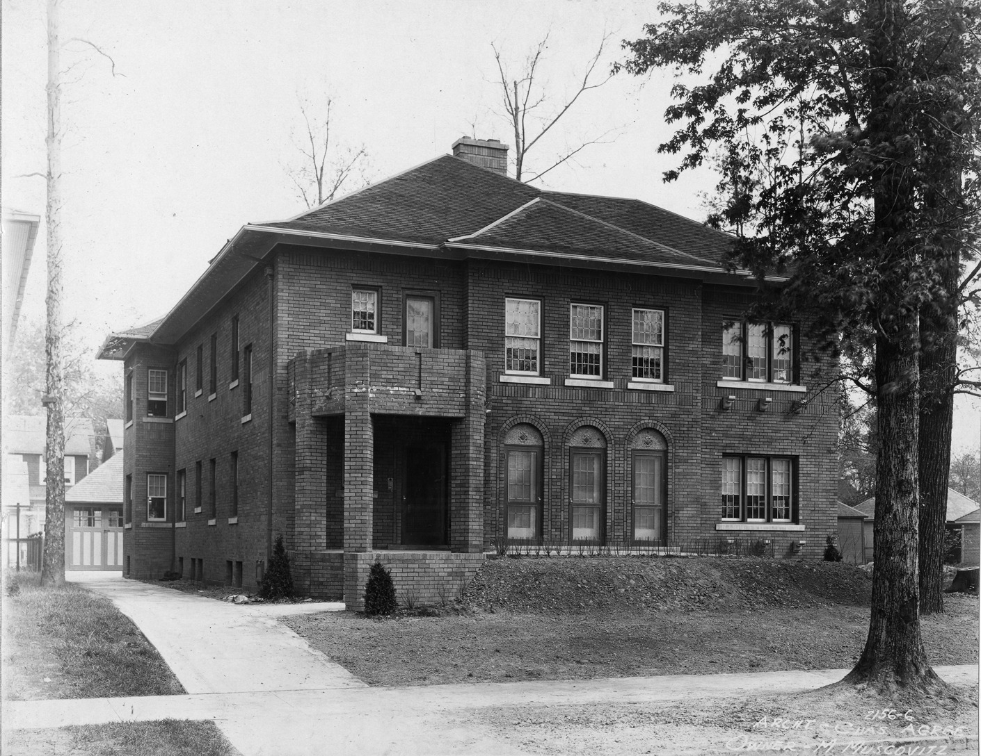 House owned by M. Muscovitz. The house is brick with casement and hood mold windows, and a balcony. Handwritten on photo front: "2156-6." Archt., Chas. Agree. Owner, M. Muscovitz." Stamped on photo back: "Commercial Photo Service Co. 25th floor, First Nat'l Bank building, Detroit, Mich. Cadillac 3431 Cadillac 3432." Photo is affixed to linen with holes punched in left margin.