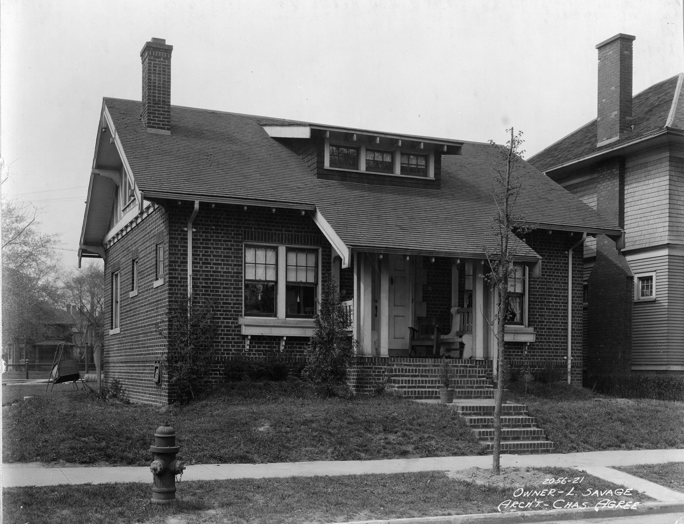 House owned by L. Savage. The house is brick with a small covered porch and a shed dormer. Handwritten on photo front: "2056-11. Owner, L. Savage. Arch't, Chas. Agree." Stamped on photo back: "Commercial Photo Service Co. 25th floor, First Nat'l Bank building, Detroit, Mich. Cadillac 3431 Cadillac 3432."