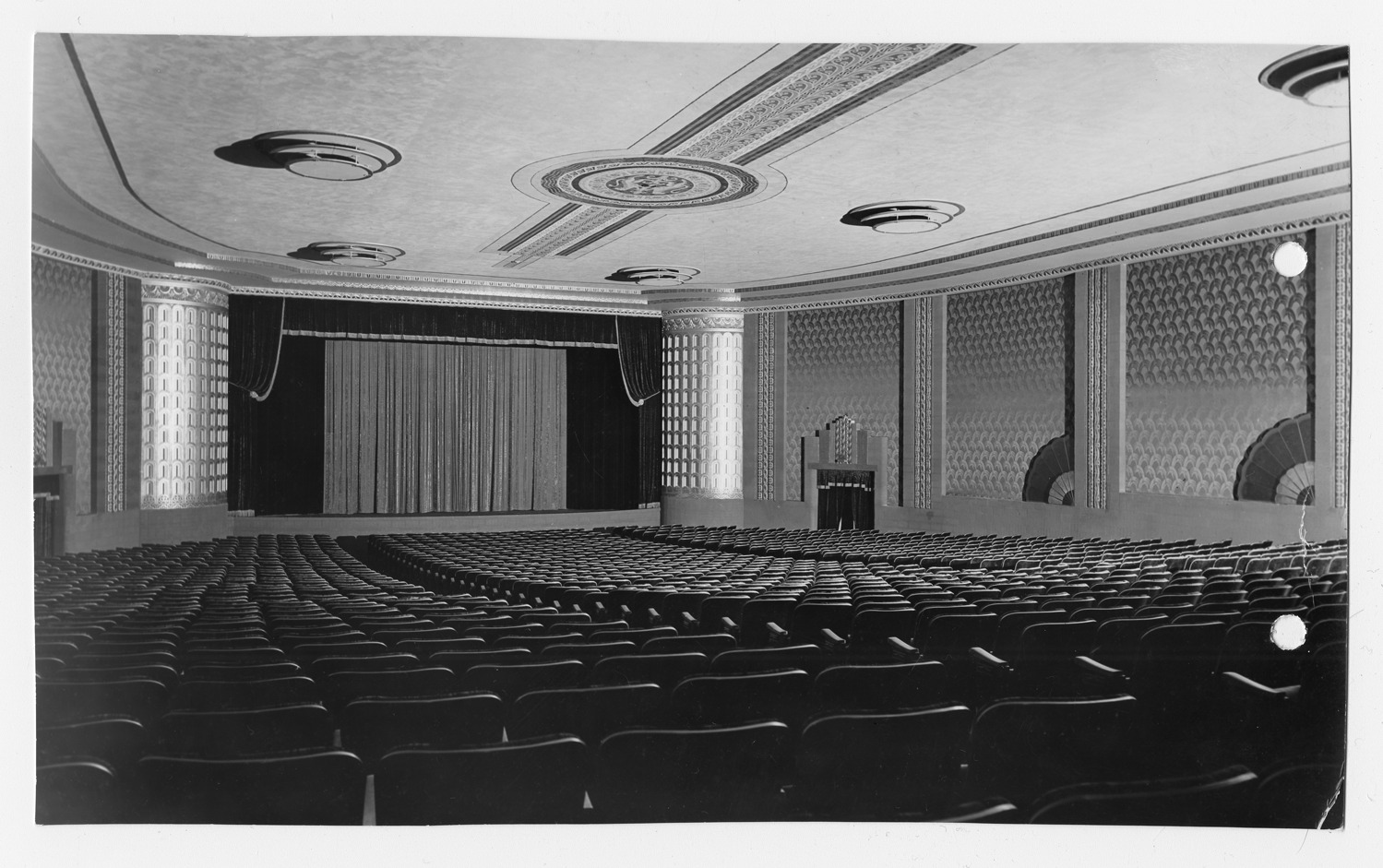 Auditorium of the Beverly Theater. View of the stage area and curtains as well as decoration on the ceiling. Stamped on photo back: "Job: Beverly Theater, Location: 10709 Grand River, owner: Mamie Kogan and Bort. J. Silberstein, Architect: Chas. N. Agree, contractor: (blank), Cinder Block Inc., 9303 Hubbell Avenue, HOgarth 1140, photographed by Elmer L. Astleford, No. 1268-A." Photo is affixed to linen with holes punched in the margin.