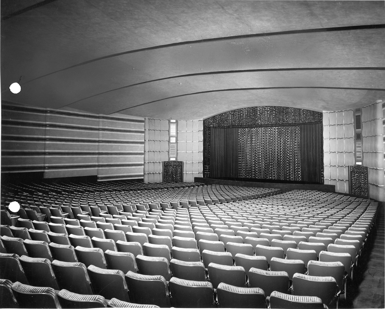 Auditorium of the Dearborn Theater. Typewritten on photo back: "Auditorium, Dearborn Theater. Michigan Ave. and Telegraph Rd., Dearborn, Mich. Charles N. Agree Inc. architects. 1140 Book Tower, Detroit, May 1941." Stamped on photo back: "Michigan Architect and Engineer." Photo is affixed to linen with holes punched in the margin.