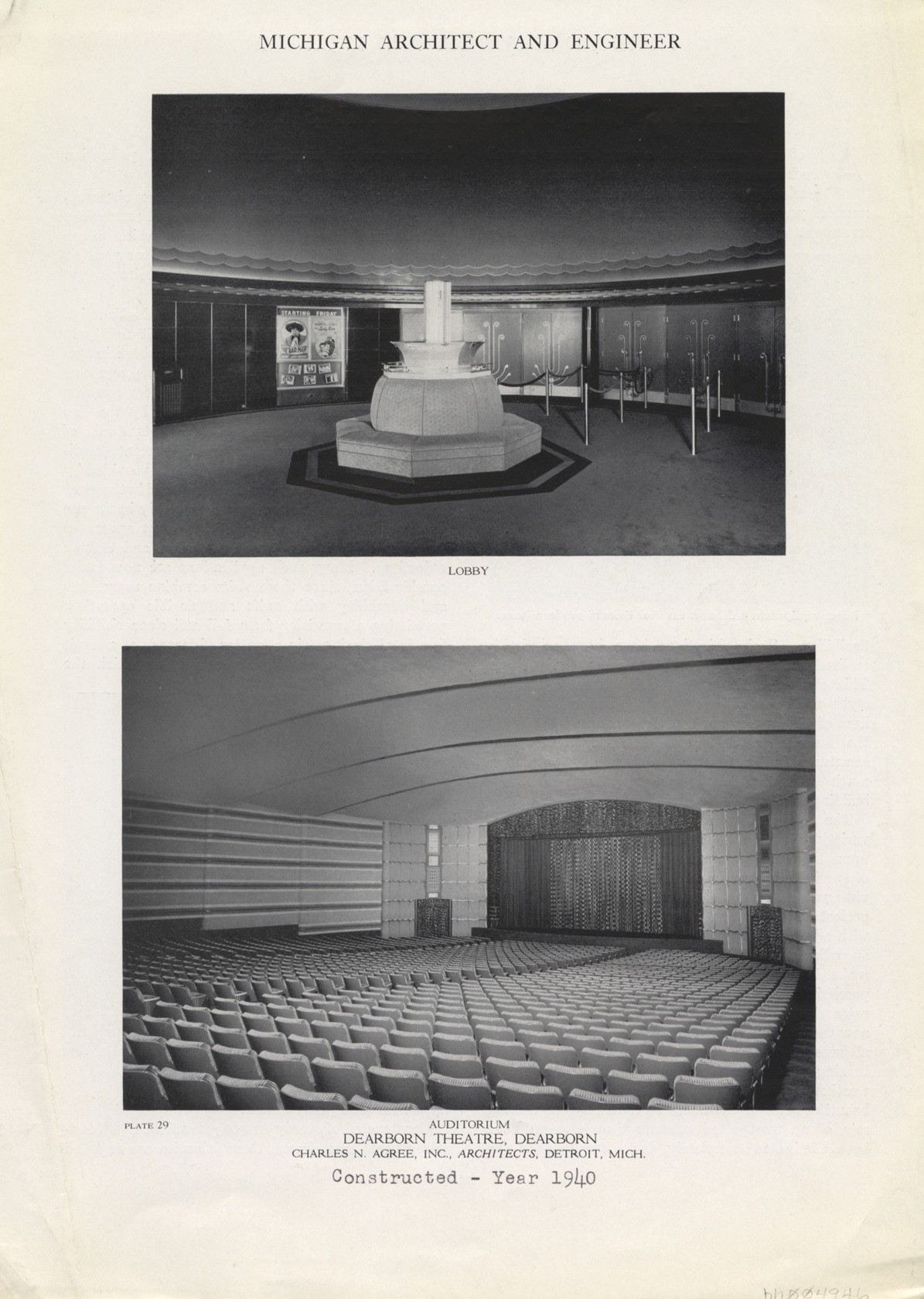 Prints of the lobby and auditorium photographs in Michigan Architect and Engineer. Printed on front: "Lobby, auditorium, Dearborn Theatre, Dearborn. Charles N. Agree Inc., architects, Detroit, Mich." Typewritten on photo front: "Constructed, year 1940."