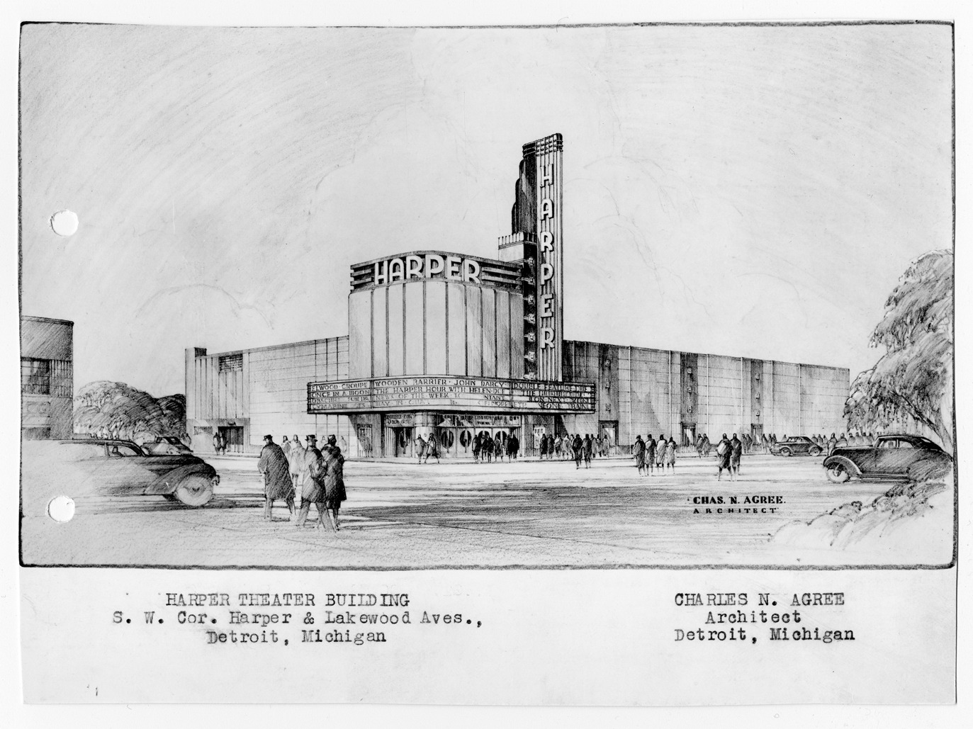 Exterior of Harper Theater. People and cars in foreground. Written on photo front: "Chas N. Agree, architect., Harper Theater building, S.W. cor. Harper and Lakewood Aves., Detroit, Michigan. Charles N. Agree, architect. Detroit, Michigan." Stamped on back: "Copied by Jeffery White Studio, Inc. Commercial photographers, color specialists. 153 E. Elizabeth St. Detroit. Chas. N. Agree, architect. Received, Apr. 5, 1939. Eleventh floor, Book Tower, Detroit, Mich." Photo is affixed to linen with holes punched in the margin.