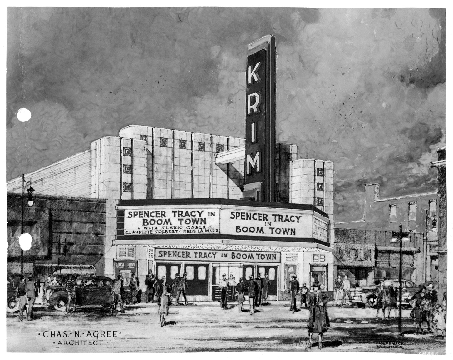 Exterior of Krim Theater and marquee announcing "Boomtown." Written on photo front is the artist's mark in the lower right-hand corner. Printed on photo front: "Chas. N. Agree, architect, 18366." Typewritten on photo back: "Krim Theatre building. Woodward Ave. bet. Florence and Louise. Highland Park, Mich. Wineman Realty Co. owners." Photo is affixed to linen with holes punched in the margin.