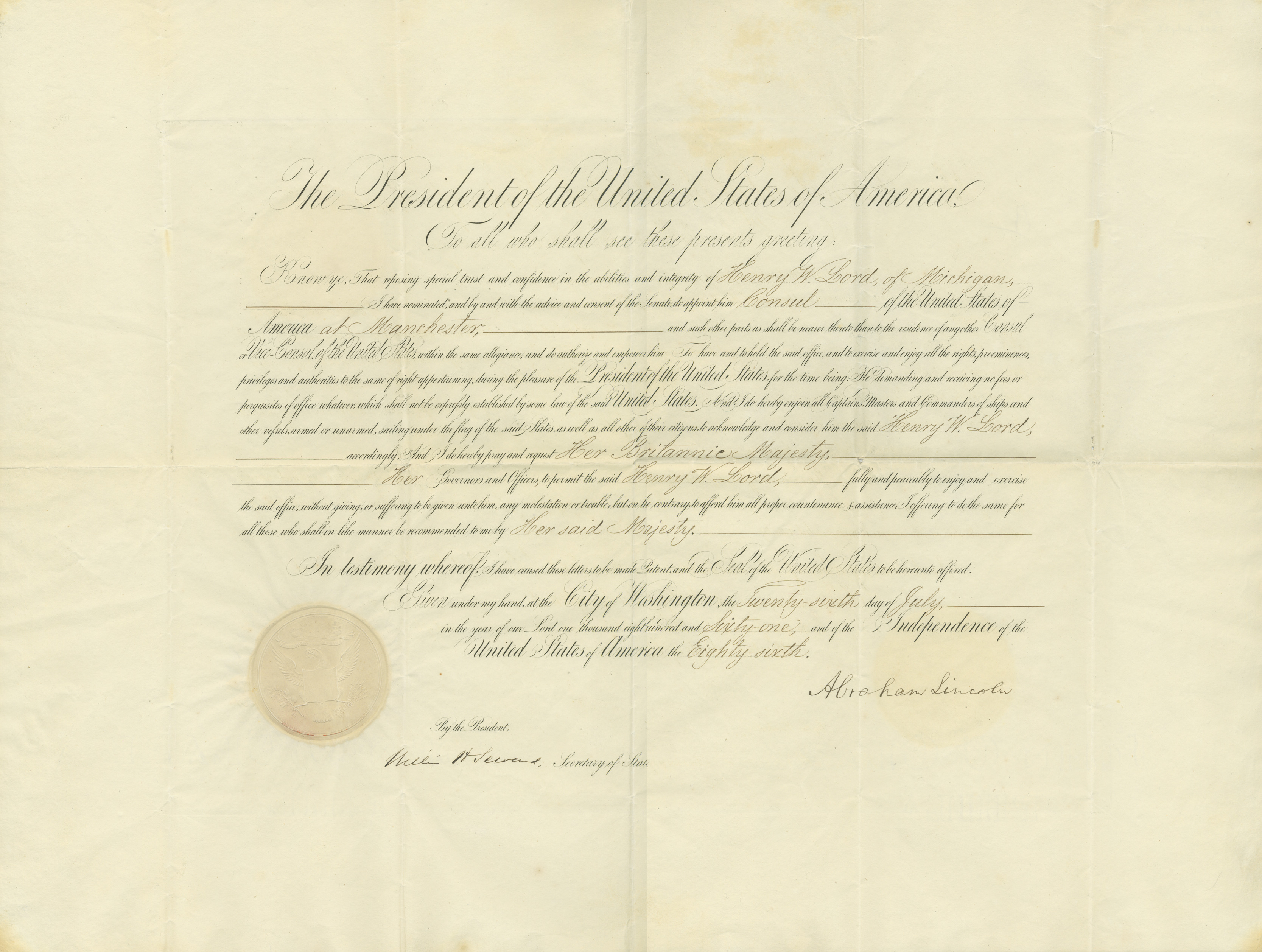 Transcript: "The President of the United States of America To all Who shall see these presents greeting: Know ye: That reposing special trust and confidence in the abilities and integrity of Henry W. Lord of Michigan, I have nominated and by and with the advice and consent of the Senate do appoint him Consul of the United States of America at Manchester, and such other parts as shall be nearer thereto than to the residence of any other Consul or Vice-Consul of the United States within the same allegiance and do authorize and empower him To have and to hold the said office and to exercise and enjoy all the rights, preeminences, privileges and authorities to the same of right appertaining, during the pleasure of the President of the United States for the time being. He demanding and receiving no fees or perquisites of office whatever, which shall not be expressly established by some law of the said United States. And I do hereby enjoin all Captains, Masters and Commanders of ships and other vessels armed or unarmed, sailing under the flag of the said States, as well as all other of their citizens, to acknowledge and consider him the said Henry W. Lord accordingly. And I do hereby pray and request Her Britannic Majesty, Her Governors and Officers, to permit the said Henry W. Lord, fully and peaceably to enjoy and exercise the said office, without giving, or suffering to be given unto him, any molestation or trouble; but, on the contrary, to afford him all proper countenance & assistance; I offering to do the same for all those who shall in like manner be recommended to me by Her said Majesty. In testimony whereof, I have caused these letters to be made Patent, and Seal the of the United States to be hereunto affixed. Given under my hand, at the City of Washington, the Twenty-sixth day of July, in the year of our Lord one thousand eight hundred and Sixty-one and of the Independence of the United States of America the Eighty-sixth. By the President, Abraham Lincoln. William H. Seward, Secretary of State."