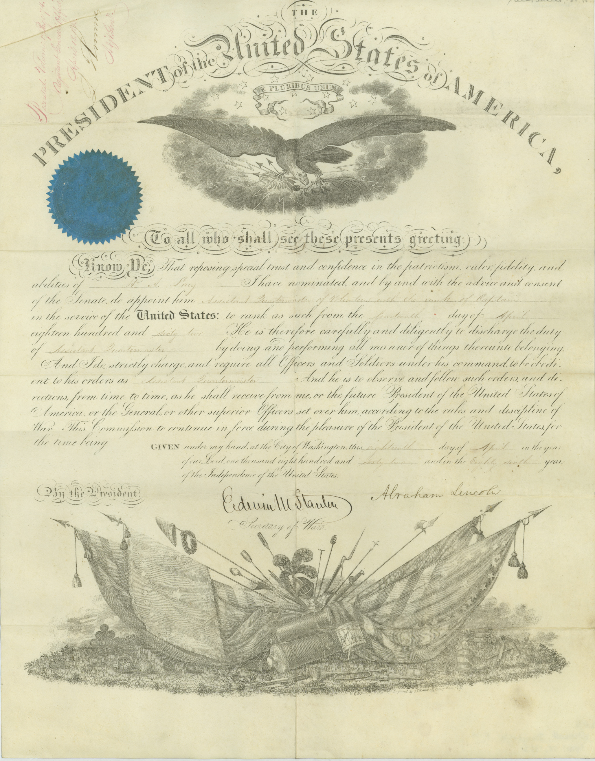 Transcript: "Recorded. Volume 17. Page 74. Adjutant General's Office, April 18, 1862, L. Thomas, Adj. Gen'l. The PRESIDENT of the United States of AMERICA, To all who shall see these presents greeting: Know Ye That reposing special trust and confidence in the patriotism, valor, fidelity and abilities of H. A. Lacey I have nominated and by and with the advice and consent of the Senate, do appoint him Assistant Quartermaster of Volunteers with the rank of Captain in the service of the United States: to rank as such from the fourteenth day April eighteen hundred and Sixty two. He is therefore carefully and diligently to discharge the duty of Assistant Quartermaster by doing and performing all manner of things thereunto belonging. And I do strictly charge and require all Officers and Soldiers under his command to be obedient to his orders as Assistant Quartermaster. And he is to observe and follow such orders and directions from time to time, as he shall receive from me, or the future President of the United States of America or the General, or other superior Officers set over him according to the rules and discipline of War. This Commission to continue in force during the pleasure of the President of the United States for the time being. Given under my hand, at the City of Washington this eighteenth day of April in the year of our Lord, one thousand eight hundred and sixty two and in the Eighty sixth year of the Independence of the United States. By the President, Abraham Lincoln. Edwin M. Stanton, Secretary of War."